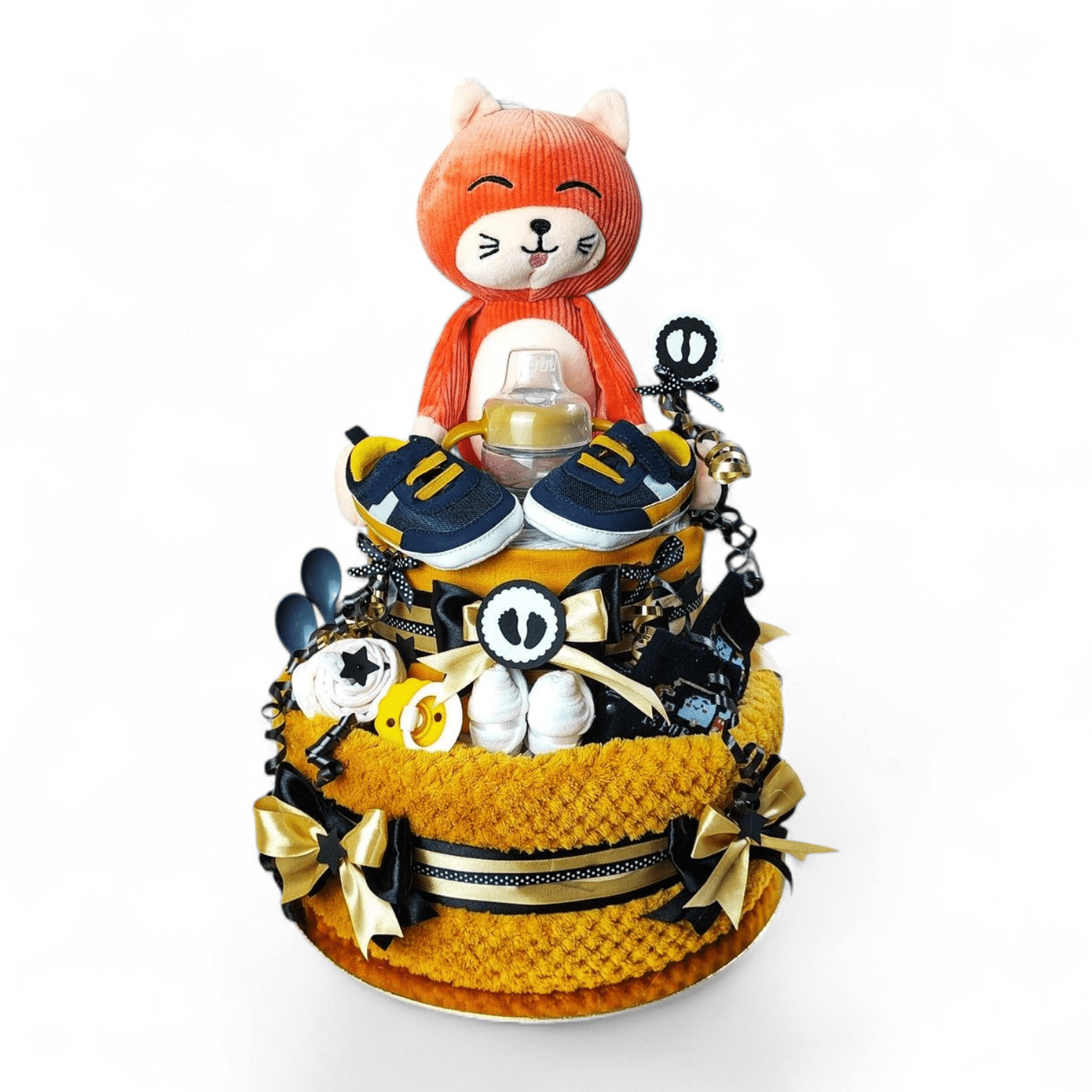 Plenkový dort je servírován na dortovém podnose, ozdoben mašlemi, stuhami a dekoracemi a dárkově zabalen do celofánu. Díky tomu je připraven rovnou k předání jako krásný dárek pro maminku i miminko. Součástí balení je také věnovací kartička s možností vlastního textu. Do poznámky v objednávce stačí napsat text, který chcete na kartičku uvést.