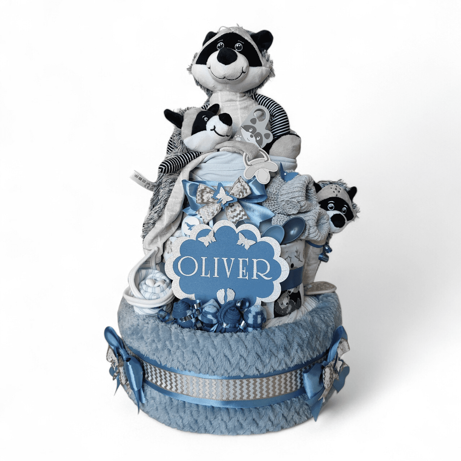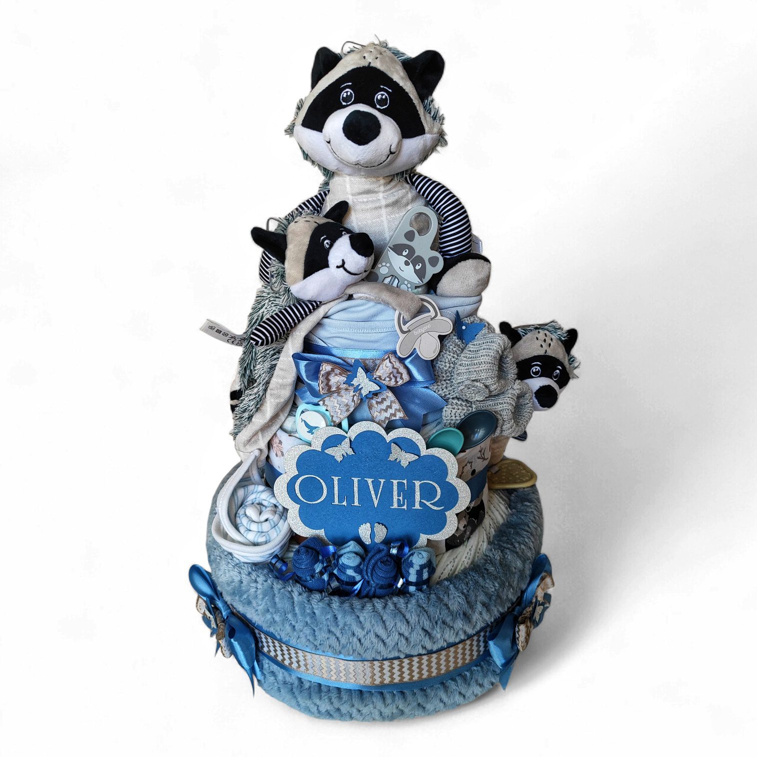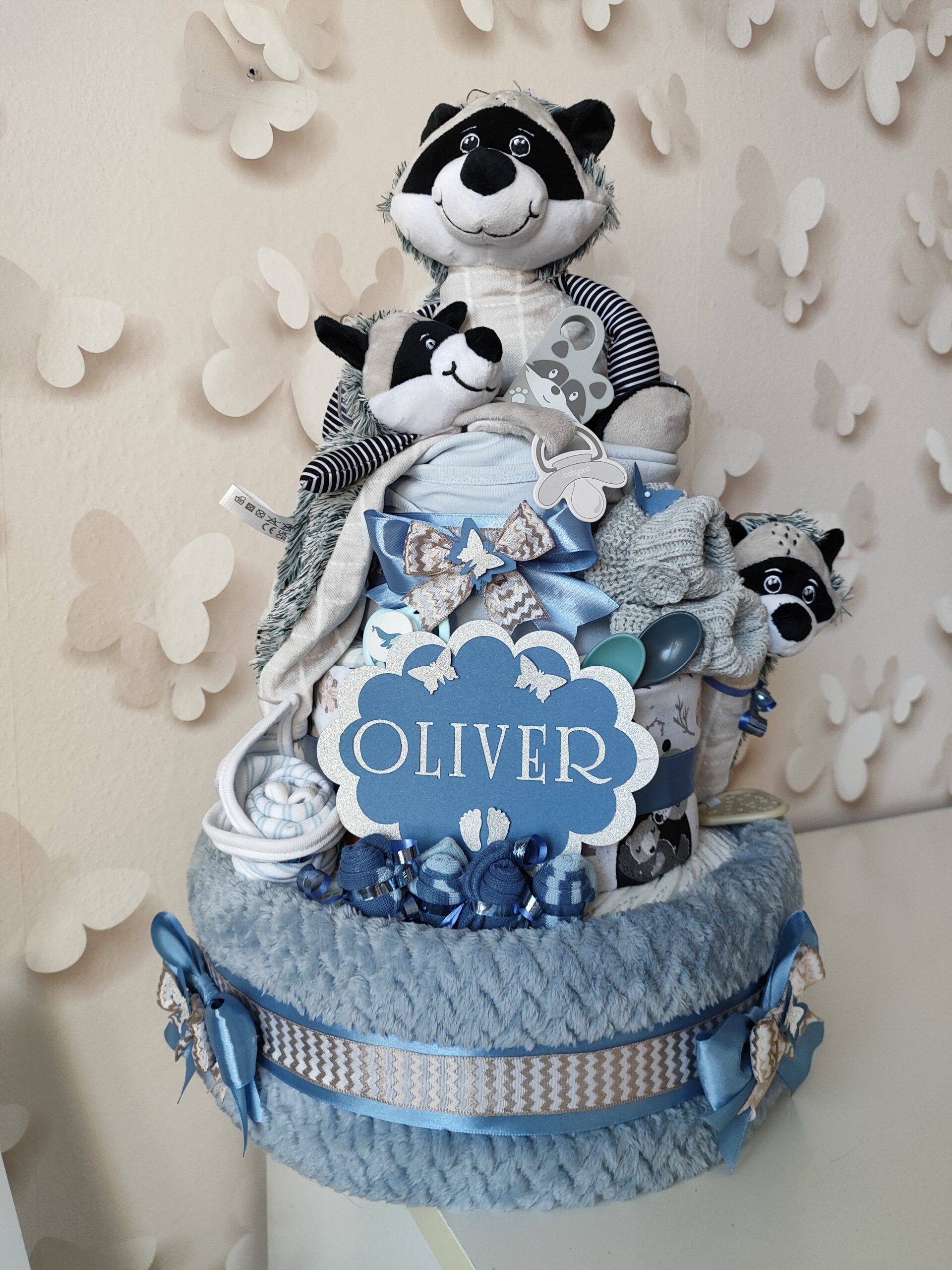 Plenkový dort je servírován na dortovém podnose, ozdoben mašlemi, stuhami a dekoracemi a dárkově zabalen do celofánu. Díky tomu je připraven rovnou k předání jako krásný dárek pro maminku i miminko. Součástí balení je také věnovací kartička s možností vlastního textu. Do poznámky v objednávce stačí napsat text, který chcete na kartičku uvést.