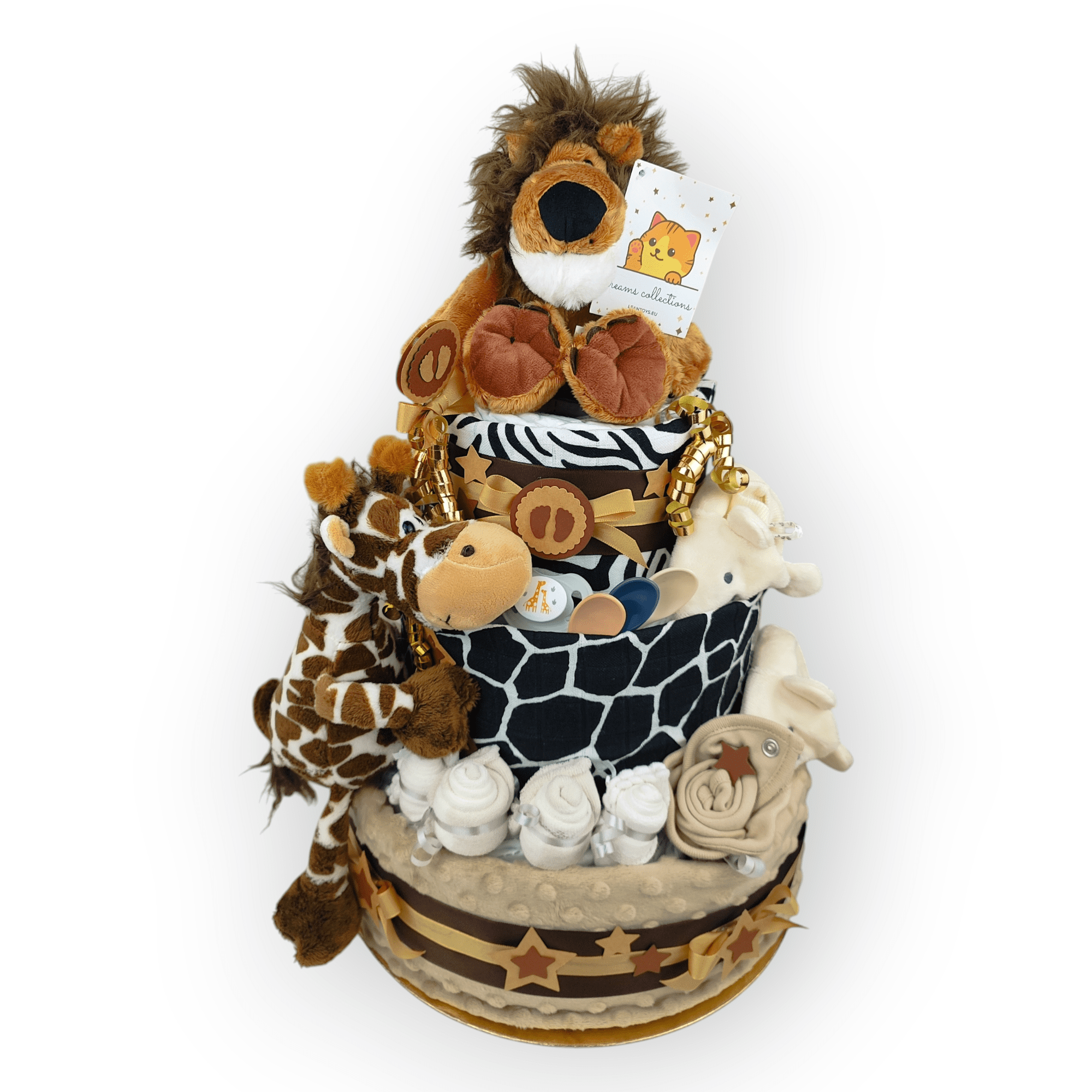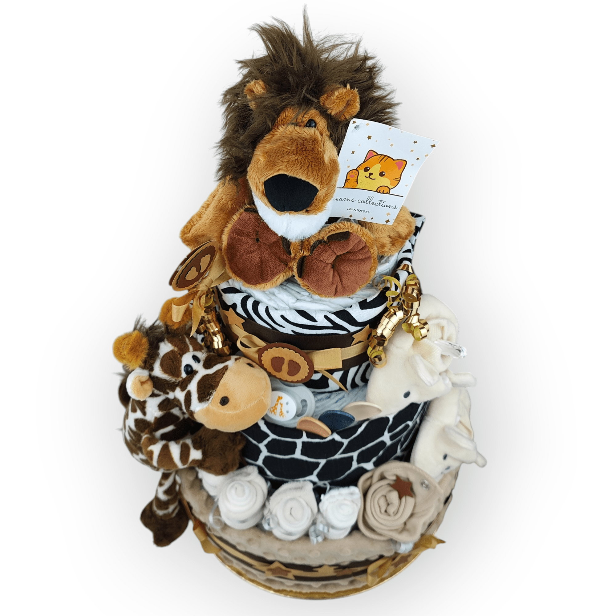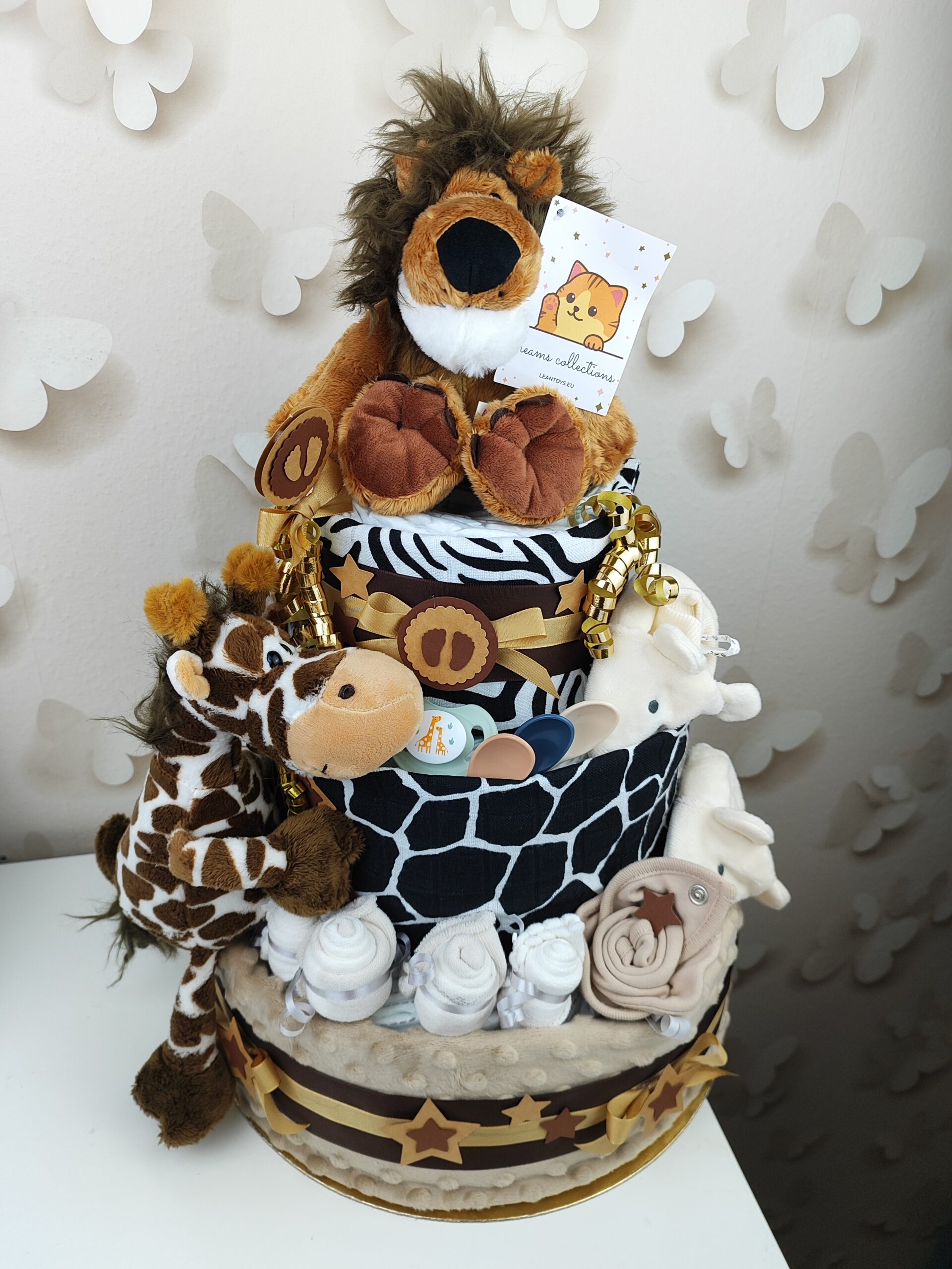 Originální a roztomilý dárek pro novorozené miminko je tento plenkový dort v safari stylu, který je zdoben plyšovým lvíčkem a žirafou, doplněn bambusovými plenami se safari potiskem.