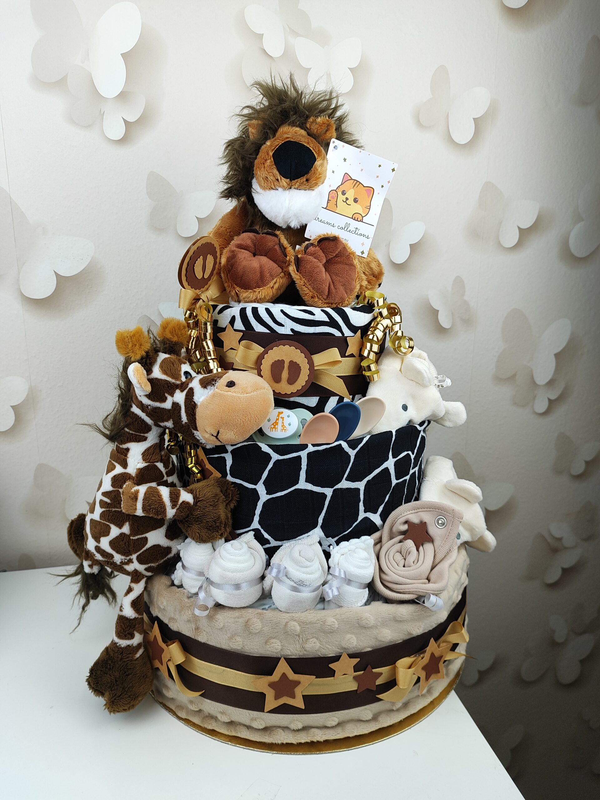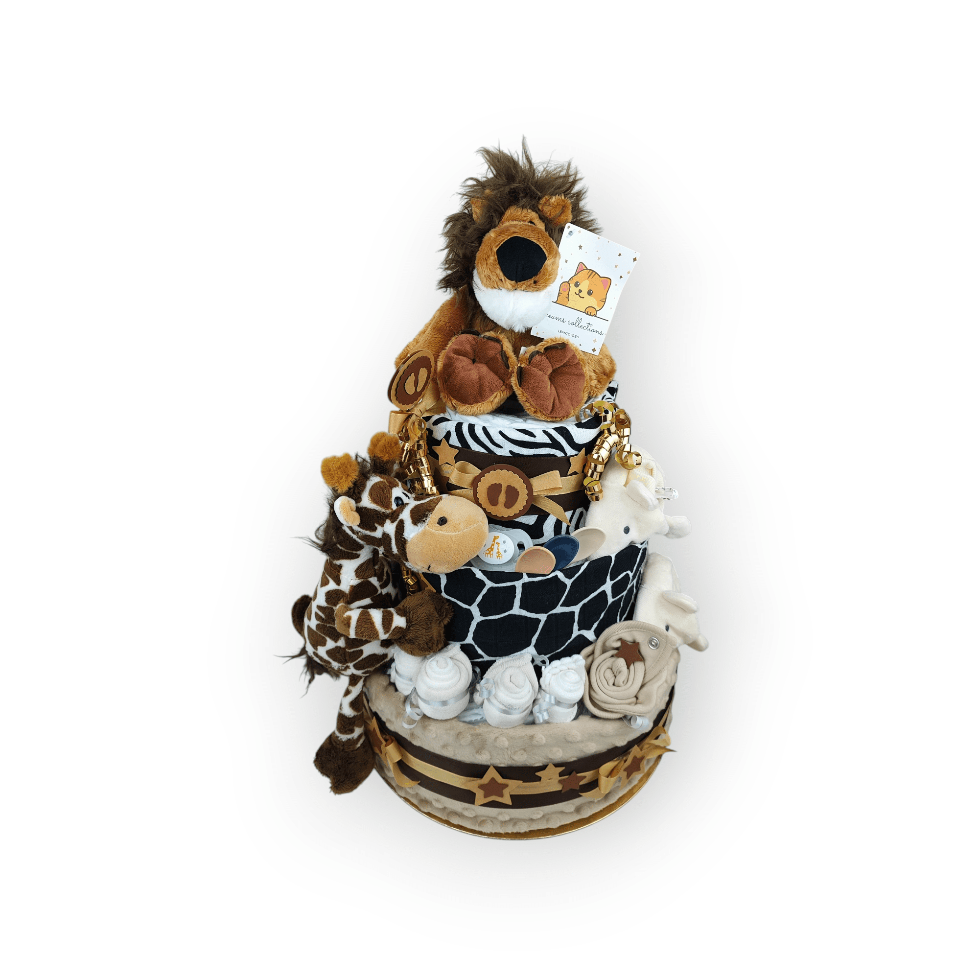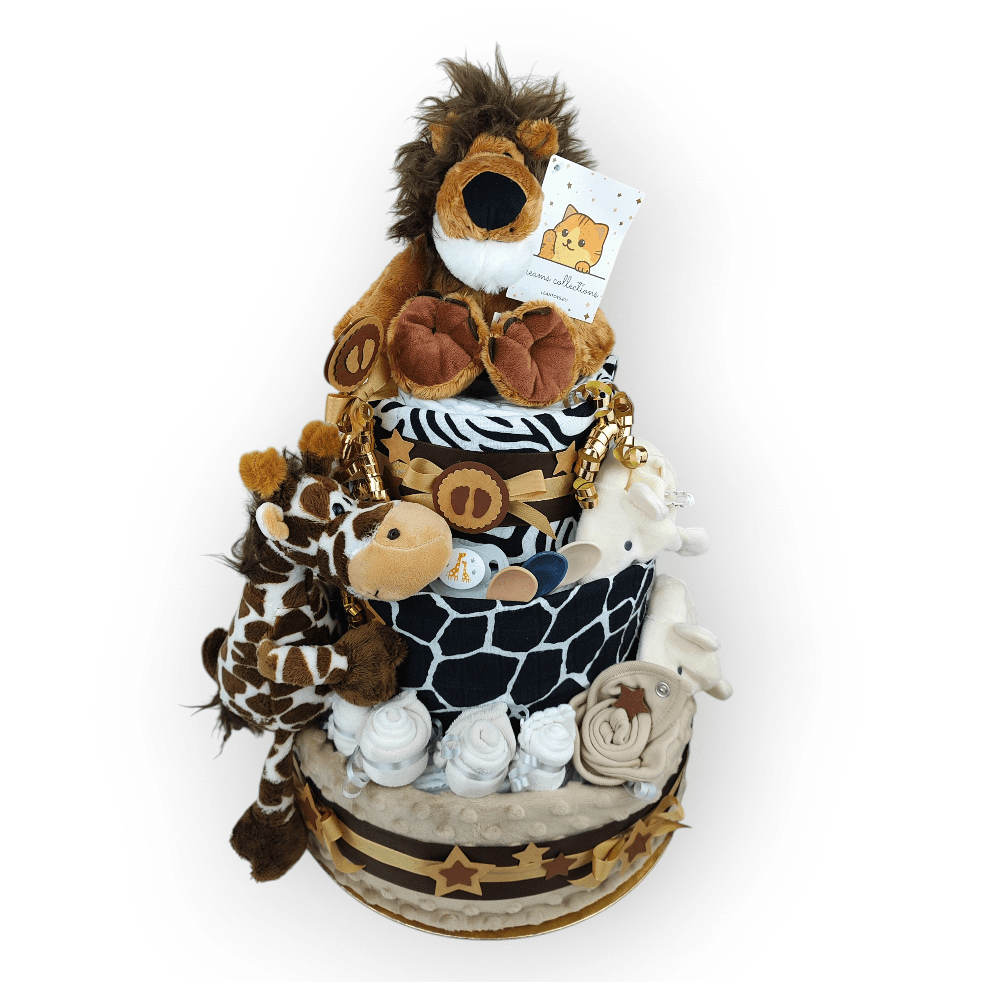 Originální a roztomilý dárek pro novorozené miminko je tento plenkový dort v safari stylu, který je zdoben plyšovým lvíčkem a žirafou, doplněn bambusovými plenami se safari potiskem.