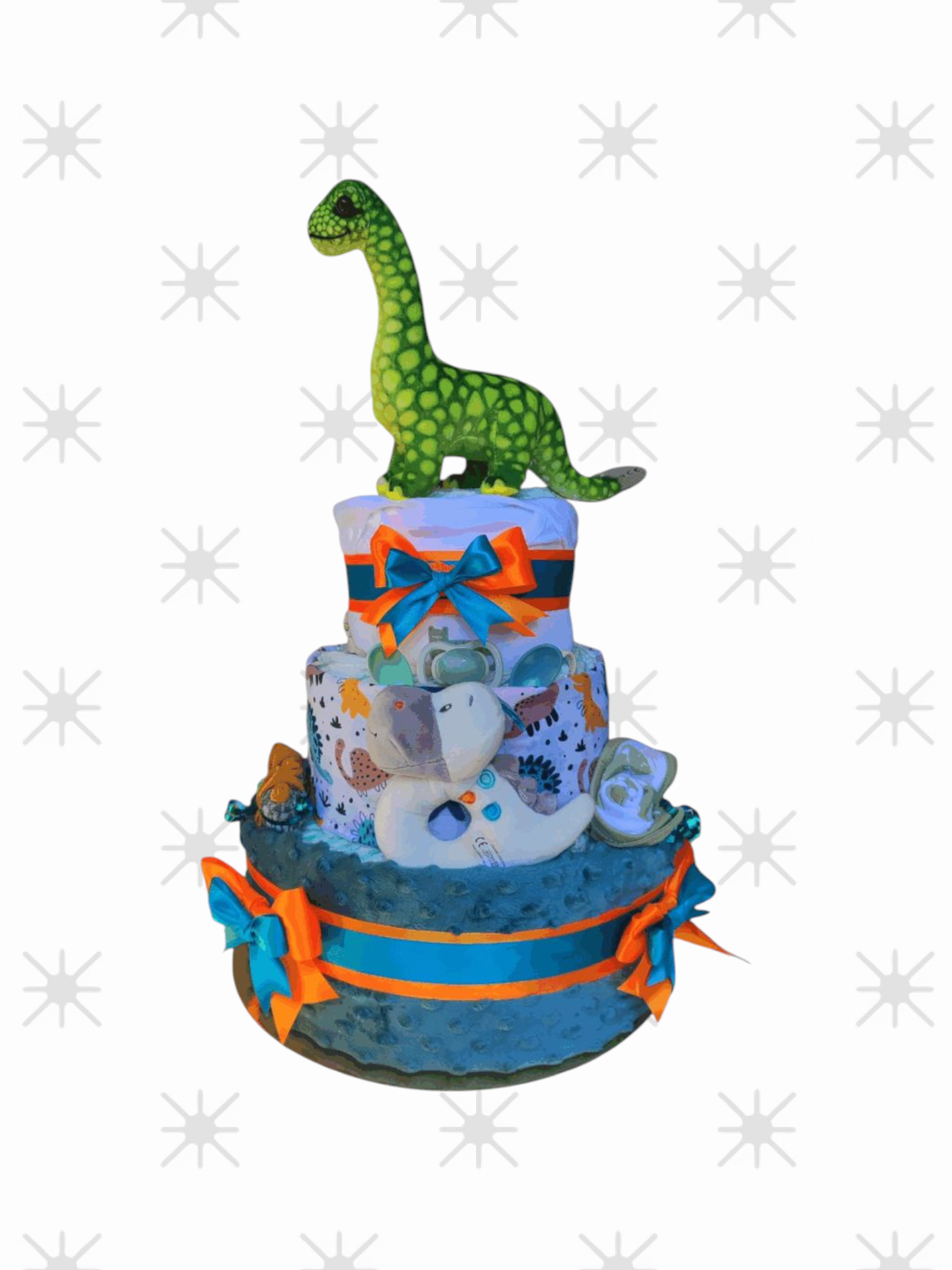 Který kluk by neměl rád dinosaury? Dinosaurový plenkový dort je jako stvořený pro malého chlapečka. Bohatá a roztomilá výbava tohoto plenkového dortu vás uchvátí.