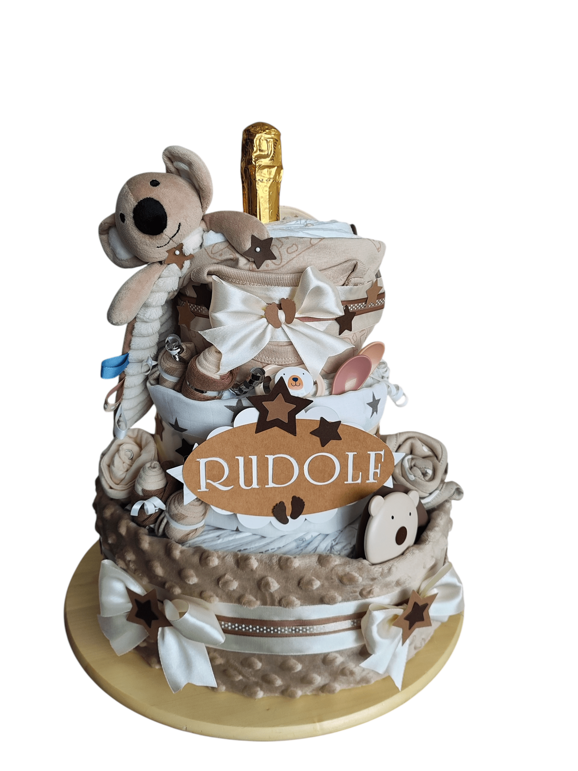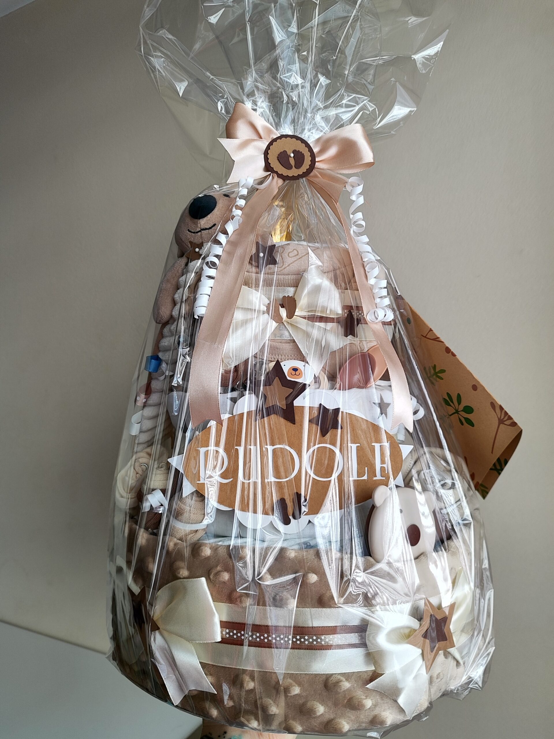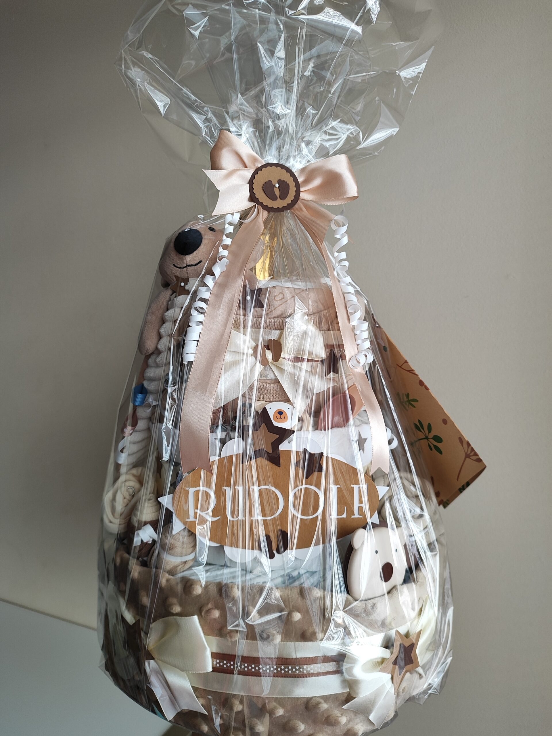 Plenkový dort pro miminko sladěný do elegantních odstínů béžové a hnědé je krásným a zároveň praktickým dárkem pro novopečenou maminku, která ocení kvalitní a bohatou výbavu pro své miminko.